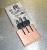 | The parts will be soldered on to the board using a solder paste with a standard, un-modified toaster oven. The oven needs to maintain 300 to 350 degrees Fahrenheit. The solder paste I use is made by Chipquick, part #SMD 291AX10. The paste is packaged in a syringe, so you do not need a stencil. Be careful not to use more paste than needed as pictured here. It causes the parts to float. The board is assembled on a piece of thin aluminum plate to help with heat transfer and handling in the oven. The un-tinned board is holding the header level. |