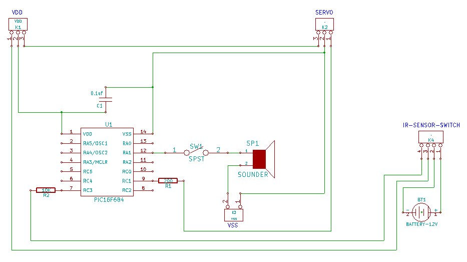 1/ The PIR sensor was connected to a 12v battery. VDD +5v from a power supply was then connected to the normally closed contacts on the PIR then through to PORTC.3 on the 16F684 via R2 a 10k current limiting resistor.
