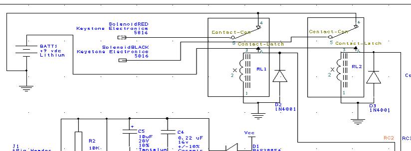 Anrati, I have designed the Relay Circuit for use with my 16F690 MCU as shown in the attached partial schematic. As you can see, pin RC2 controls one of the two SPDT relays and pin RC3 controls the other. I have purposely wired the ground from the battery rather than the positive terminal to the normally closed contacts on the two relays so that in case there is any leakage in the Solenoid_RED or Solenoid_BLACK wire circuits it won't drain the battery when the relays aren't actuated.