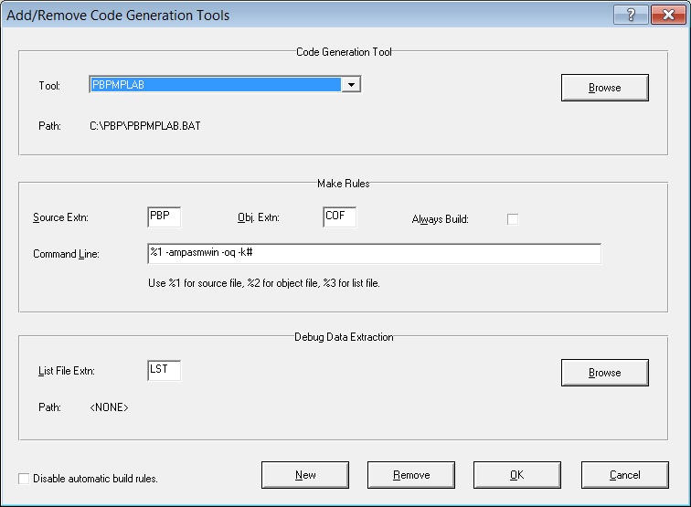 Under "Code Generation Tool", drop-down the box and select PBPMPLAB
