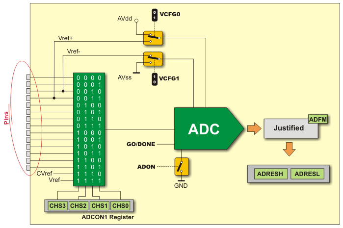 Thanks you for replying. I'm not having problems on the software side... I've used the ADC module quite often without really grasping some of the inner workings...(for that I simply select the channel, wait the sampling time, set go/done)