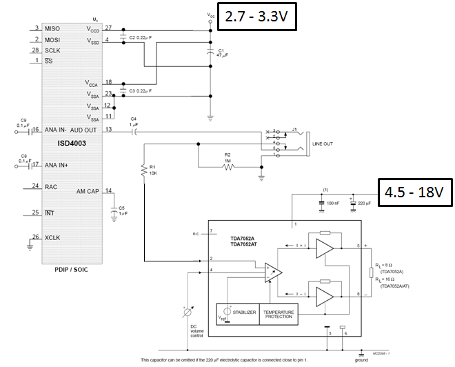 Can anyone help me regarding the schematics interfacing ISD4003 voice chip to TDA7052A audio amplifier??