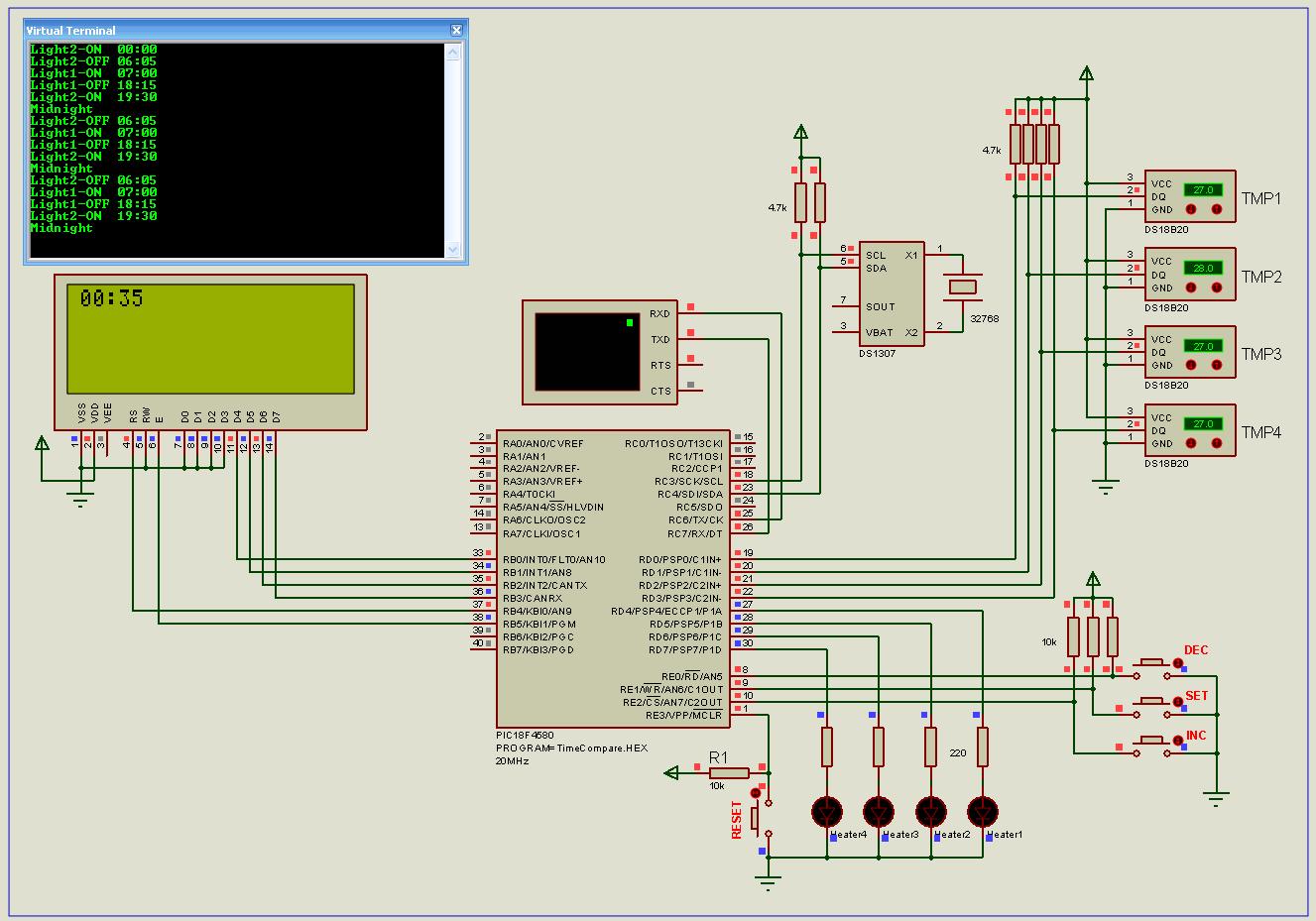 setting the time on to 00:00 and the off time to 00:01 the LCD displays 00:50 and 01:00 respectively. So obviously DT's routine will never match the times set..... I don't know why this has happened because in the original code it matched perfectly.... :(