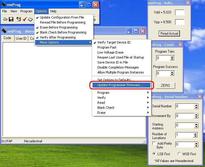 Now, it comes the real problem :confused:. When I try to program my 16F1939 using my Melab U2 Programmer, the software can not find the chip. So, I went ahead and upgraded the firmware hoping to get support for this new chip.