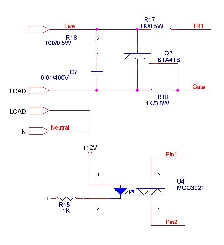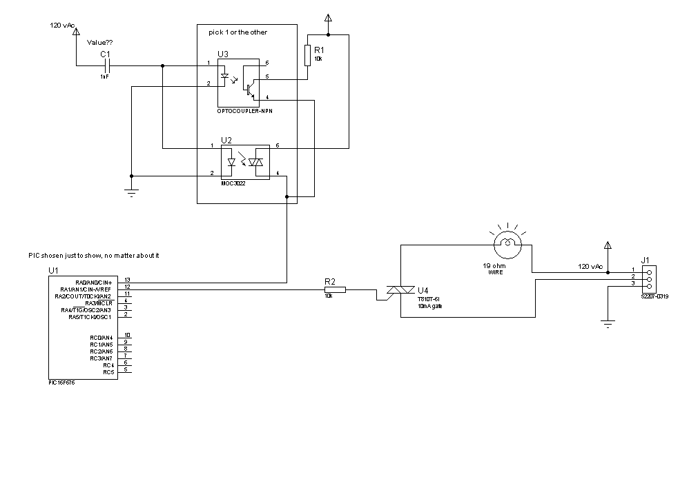 About my schematic: The values for the resistors are just the default values. I know they are not correct. The cap for the input to the opto's, I have no idea what value this should be. Also have no idea yet as to which opto style I want for the zero crossing side of things. Maybe neither? And I see I have connected the top opto incorrectly. I ment to groung the emitter and take the signal from the collector.