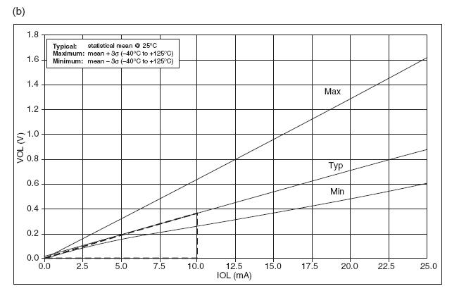 By calculating the slope in the dashed line it can be determined that the internal resistance for VOH = 3.0V is equal to ROH = 130 Ohms. Now, in the case the output is low, VOL = 0 then the VOL-IOL graph is