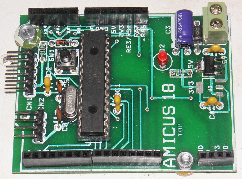 I made a simple, no fancy , no frills, Amicus18 development platform adhering to original dimension for a shield. This Board, as you can see, does not have the USB FTDI section, so no bootloading possible. Alternatively, the UART pins are brought out at a 4 pin connector on the board. I would be posting the details of this board soon on myAmicus site for others to gain from it.