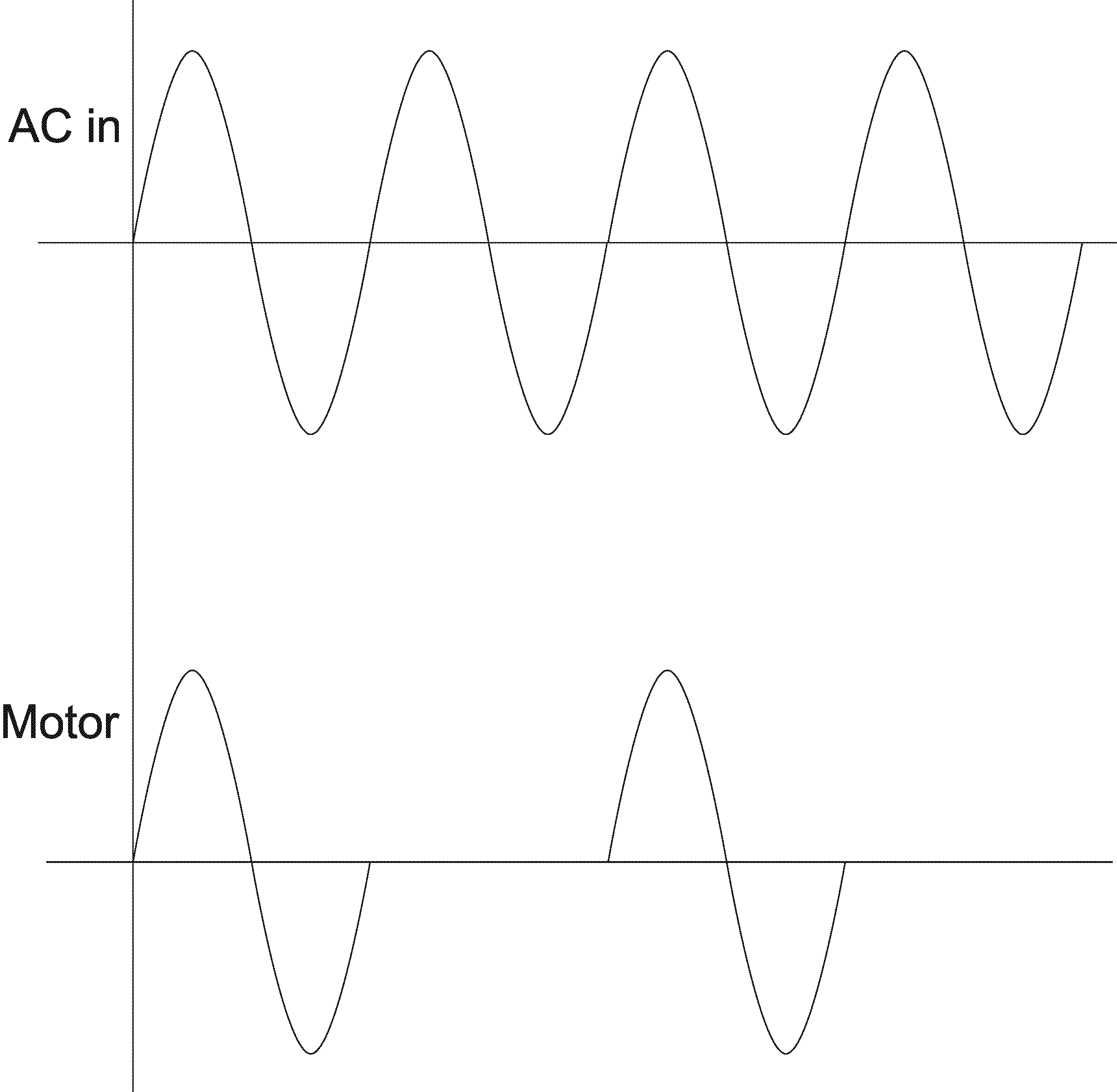 I know of a commercial product that switches at 1/2 cycles. At 50% power it only passes the positive half of the cycles. This causes strange readings on power meters. I don't know why it does not heat the motor. Maybe it does.