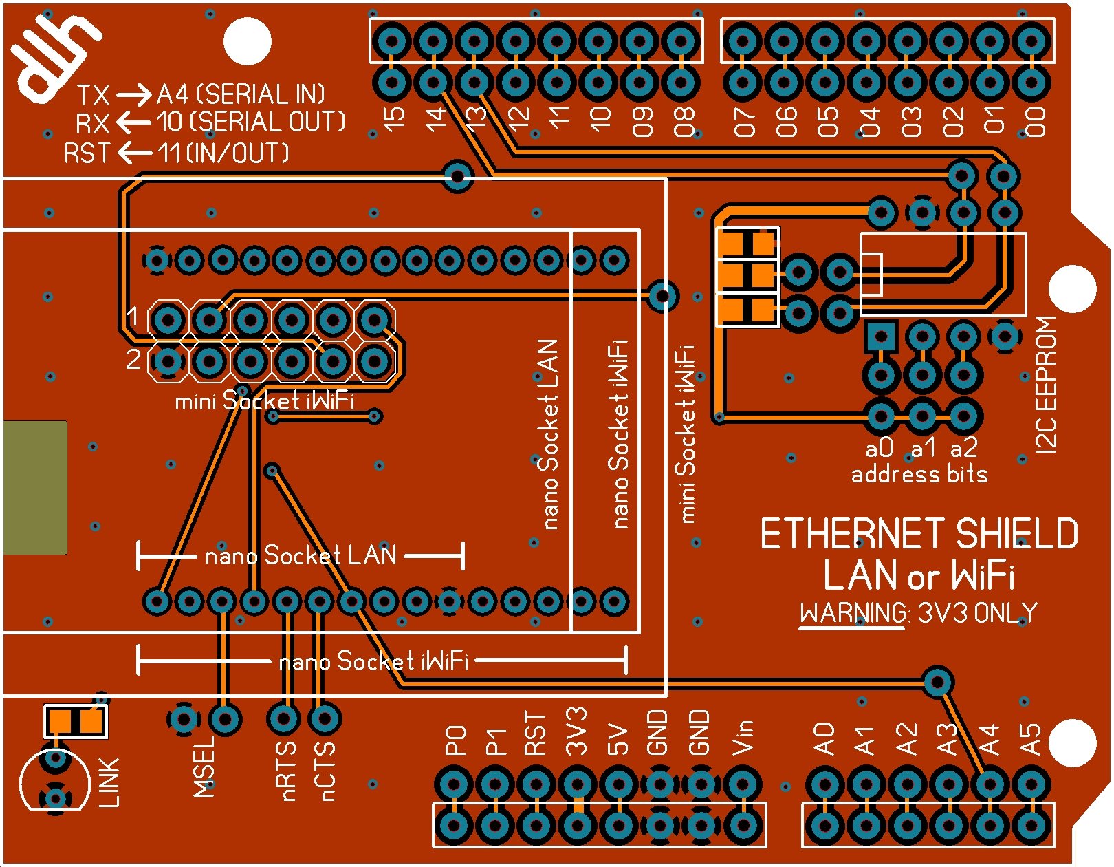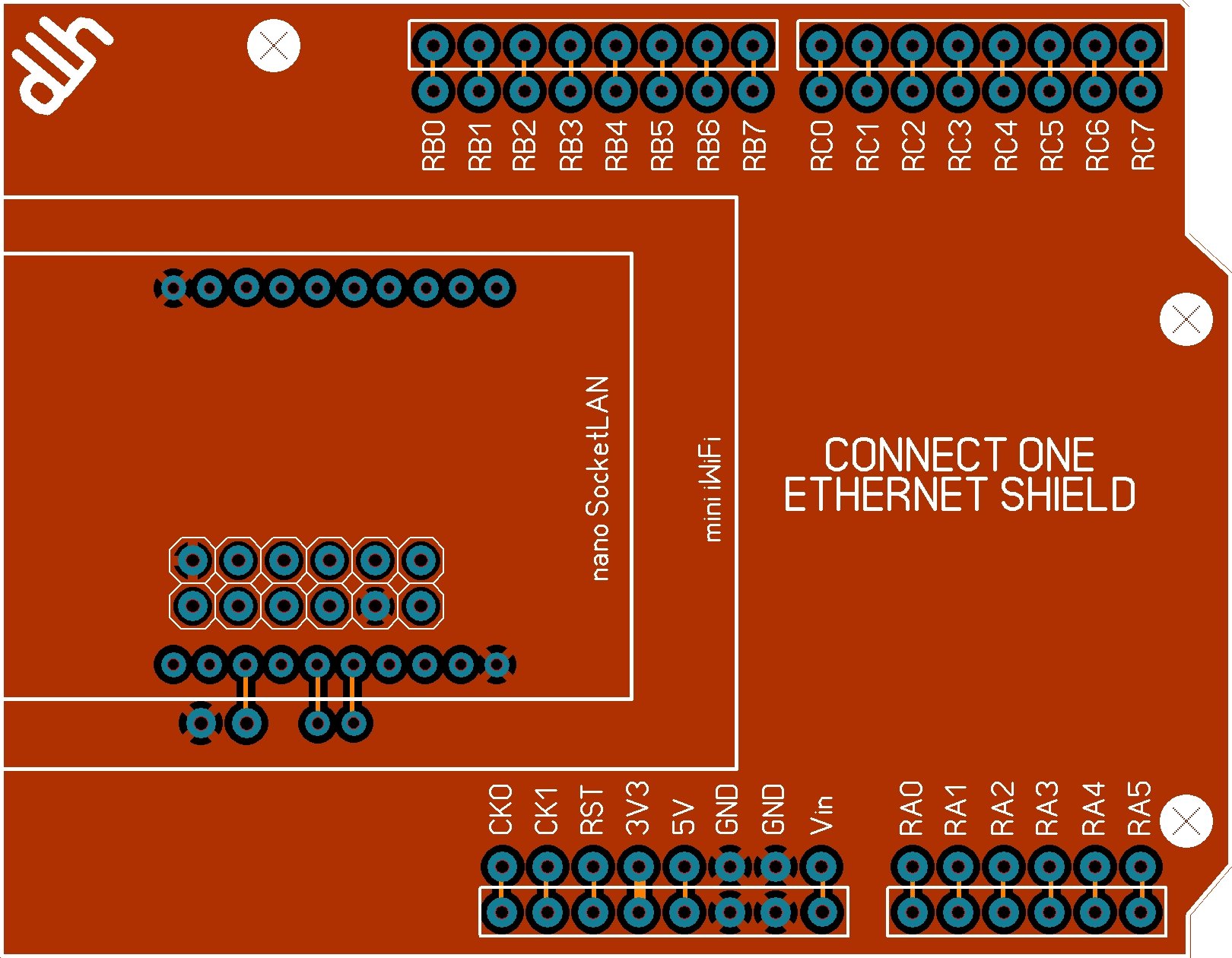 I think I can forget about seeing the Tibbo firmware anytime soon so here is what I think is the final layout for the ConnectOne ethernet shield. The TX, RX connections are dictated by the PICAXE and Xino. I still need to check this with the Xino designer but I think it's ready to have CircuitMart make some prototype PCBs.