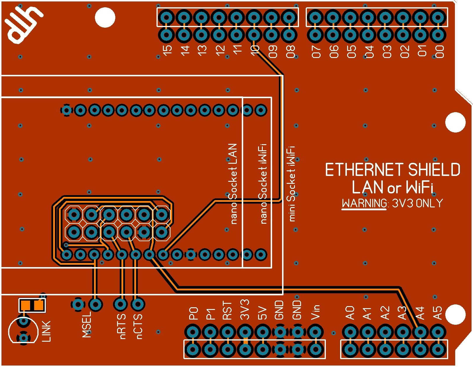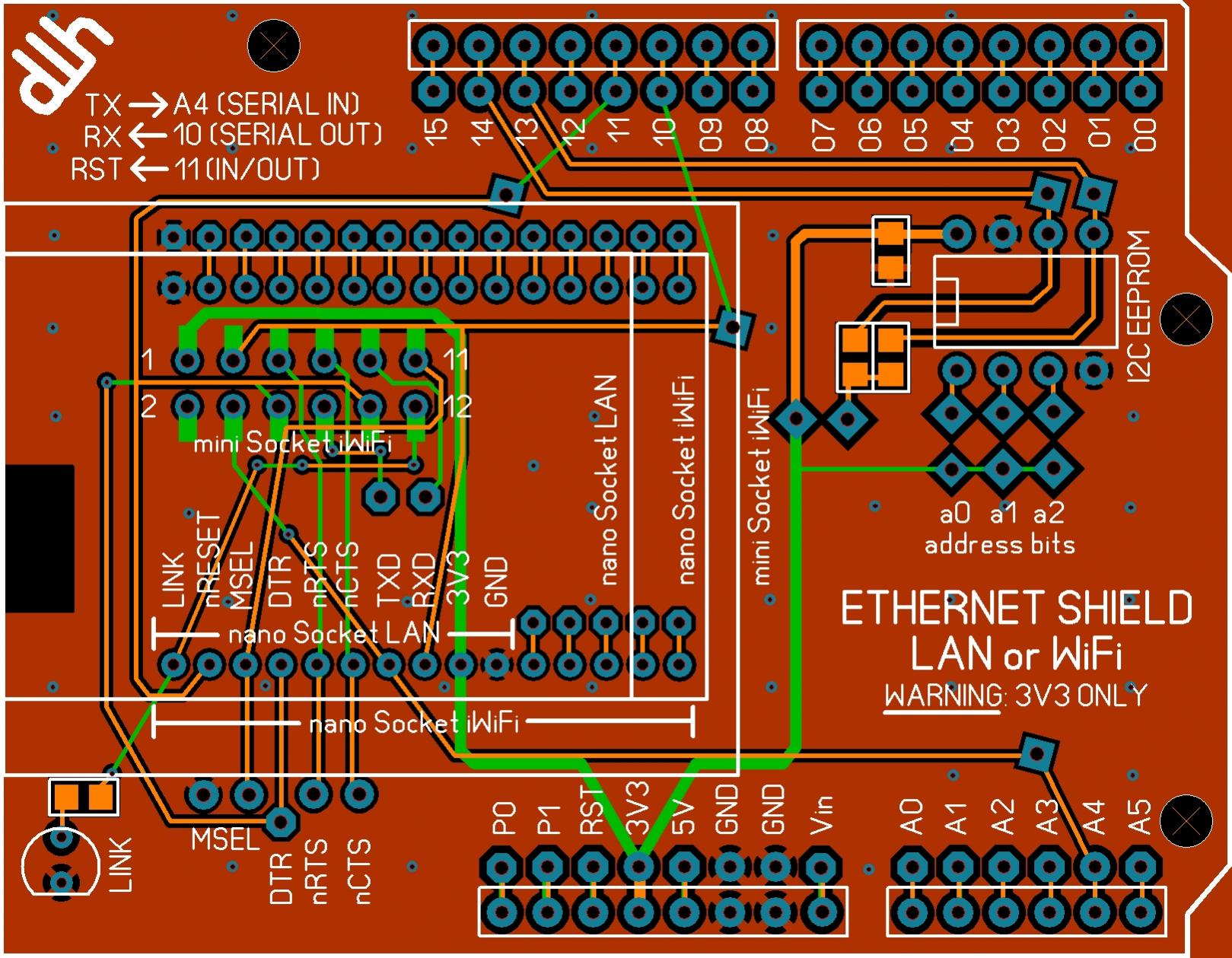 I've been working off the drawings in the datasheets so I think things are OK but I have been jumping back and forth between the two shields as well as two other projects. I'll print out a life-size copy of the .PNG and see if things fit. What, specifically, looks wrong? It mounts in the 10 leftmost holes of the two 15-pin sockets (the nano Socket iWiFi uses all 30 & the iWiFi uses the 2x6x100 socket) with the RJ45 to the left. (Spark Fun has 10-pin and 5-pin 2mm sockets which I hope will work end-to-end for the 30-pinner. They will mail small shipments, saving cost.)