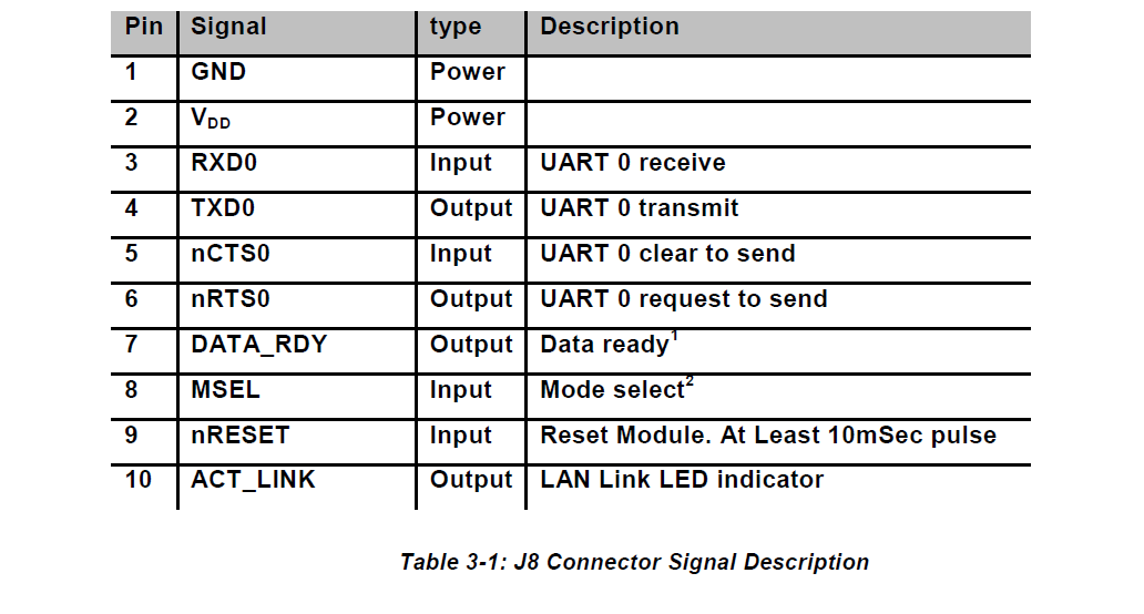 Does your data sheet show J8, pins 1-4 being VDD, VSS, RX, and TX (I may have the order off but those are the four pins used on the module I have)