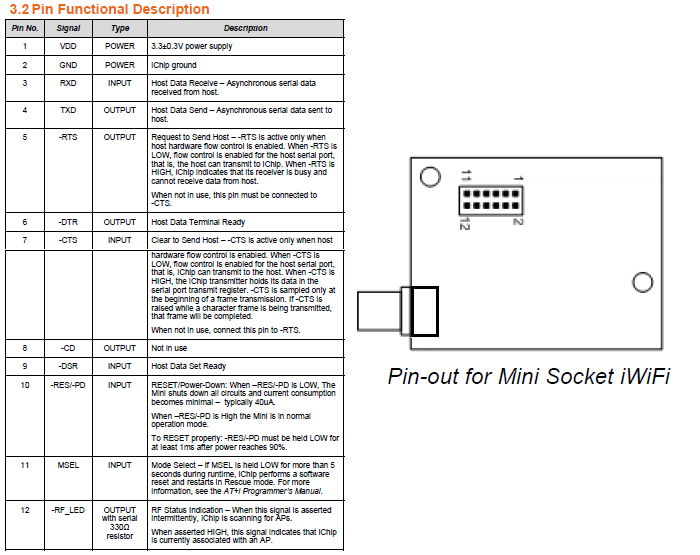 Here is the list of connections for the mini Socket iWiFi with my modified pinout drawing that presents a top view.