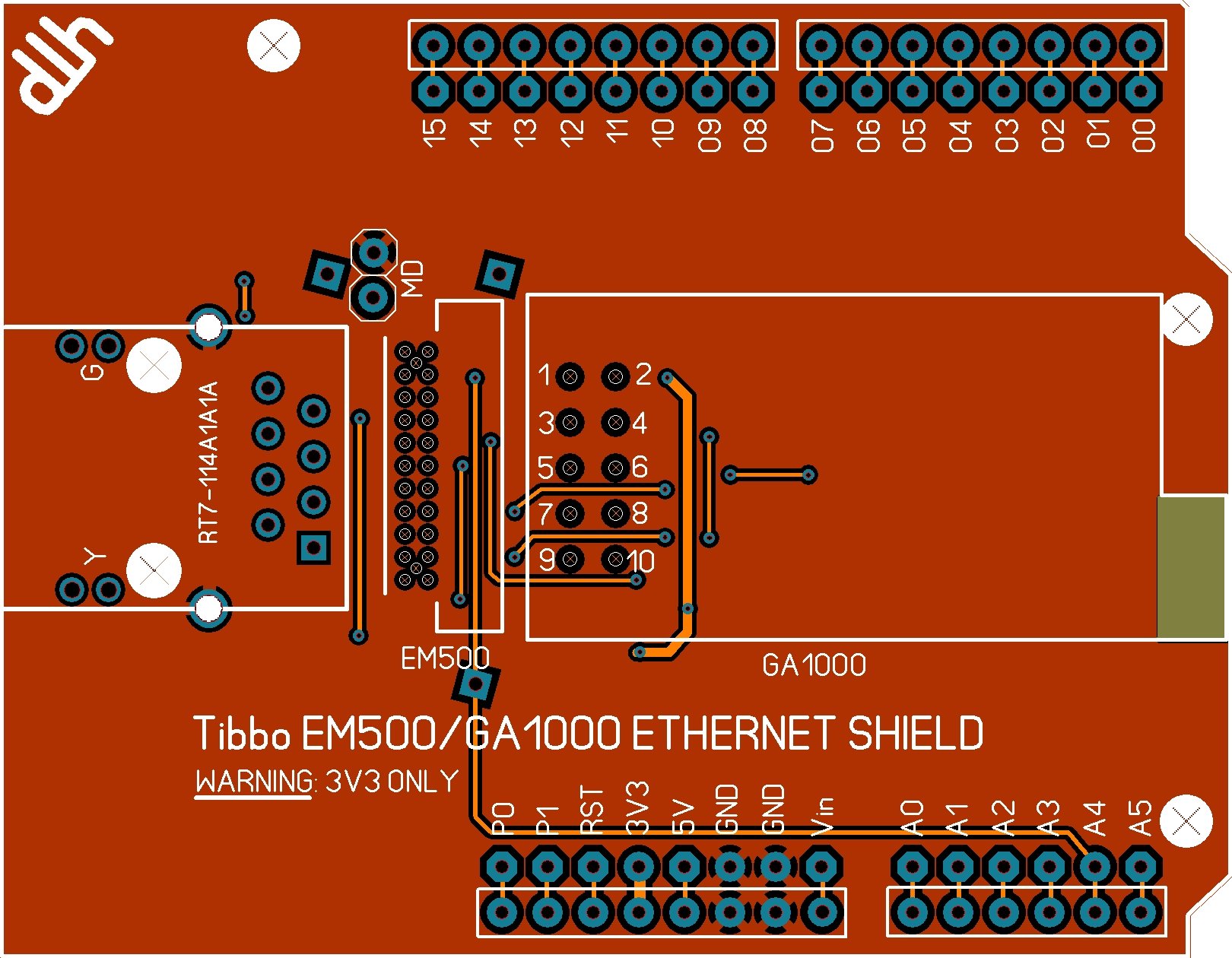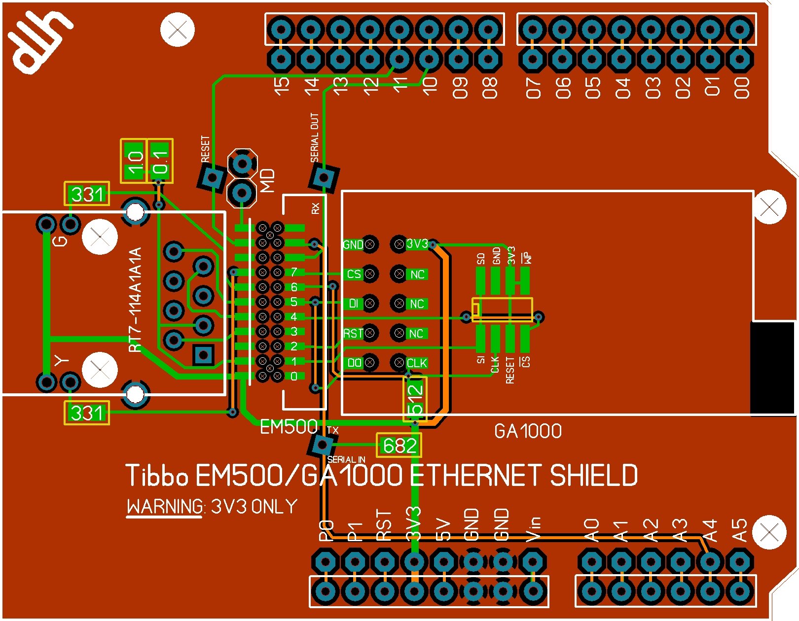 They also provide some very confusing pinout diagrams which they say are mandatory for the GA1000 but only recommended for the flash memory. The pinouts seem to have superfluous duplications. I've asked for clarification, sending them my desired pinout which conforms to the mandatory part but eliminates the superfluous connections to flash (i.e. extra CLK, MISO, MOSI lines). I'll have to await their reply to finish this shield.
