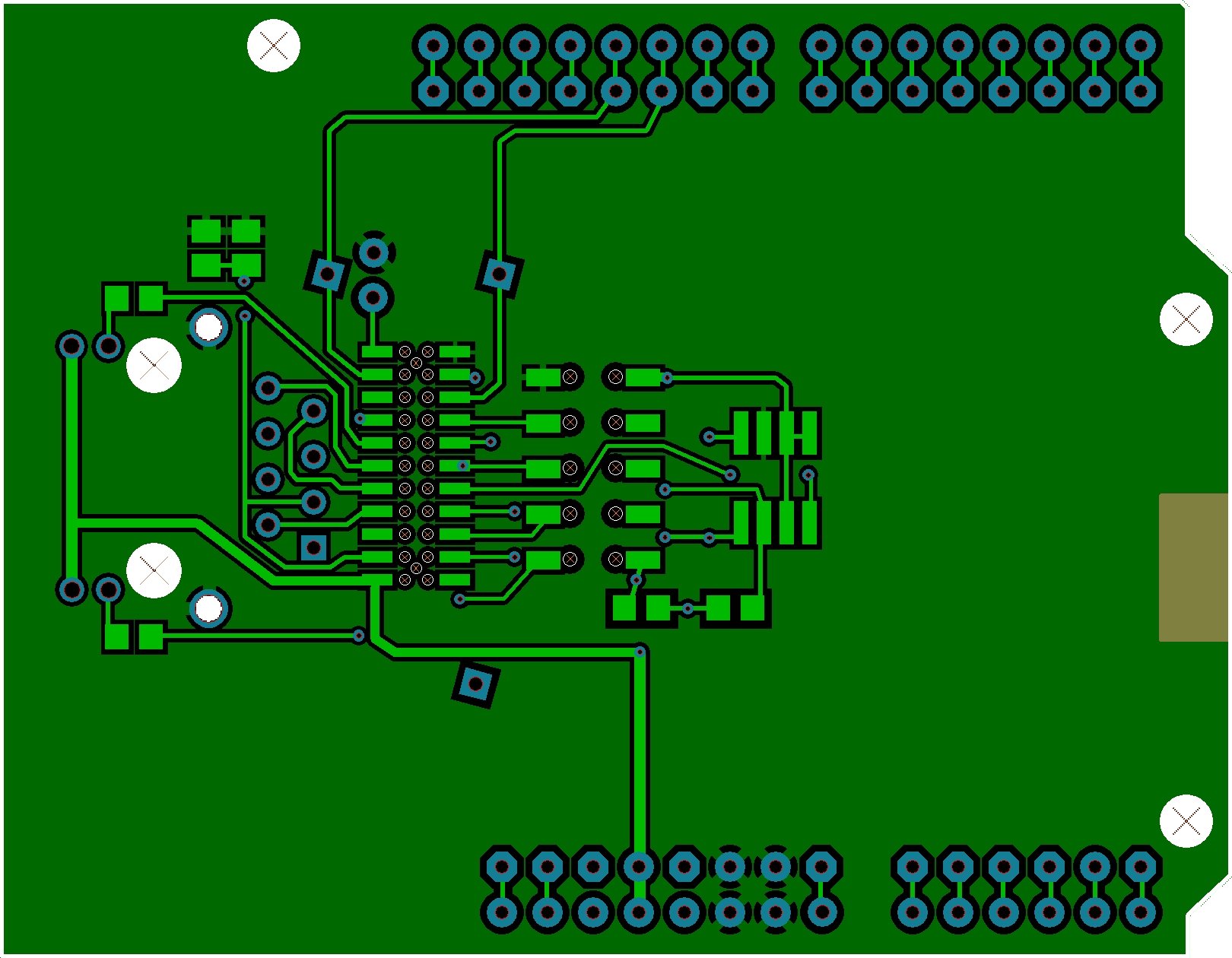 I've encoded a little info in the shapes of the pads. The slightly askew square ones are for rerouting the three IO lines should it be necessary. The octagonal ones have no connections. The round ones are connections in use or those within the headers.