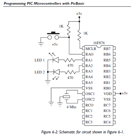 I have a noob question. i have been playing with this all night. Im using Microcode 3005 and PBP 2.46. Chip is 12F675. I have checked the usual...blinked the LED's using blink program as a test, and tested the button. All i get is: LED 1 stays on. Schematic is similar to the one above 'cept RC osc, different chip of course.