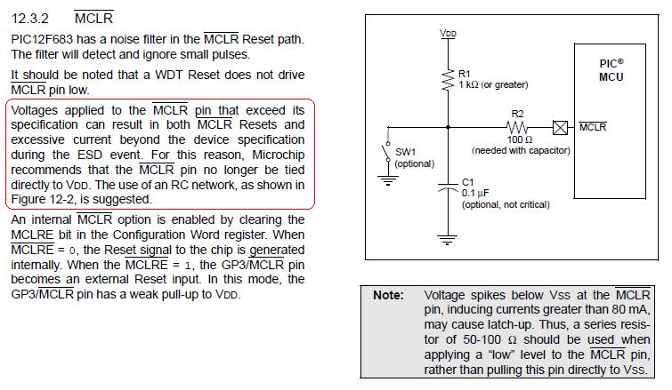 All the PIC documentation I have ever read says to tie the MCLR pin to +5V via a 4k7 resistor. If an application will not use the MCLR function (ie no switch to 0V as a manual reset) is it OK to simply wire the MCLR pin directly to +5V or does it still need to go via the 4k7 resistor?
