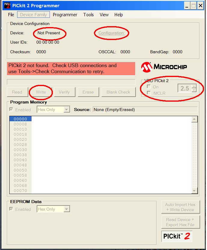 If the pickit does not auto detect the type of PIC you are using you can set that from one of the ovals... I run my pickit programmer from two different computers, one seems to auto detect the pic model. the other seems I have to set it through the dropdown in the pickit program window. That may be due to different versions of pickit software.
