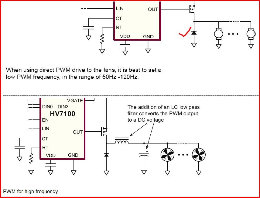 Coupling that to a larger current drawing device is a problem. Of the schematic page provided, the top drawing has pulses at GP2 to the MOSFET of about 2.3 volts and won't power on the fan. I thought once I figured out how to get the pulses up to around 5 volts the FET would turn on and I'd be golden.