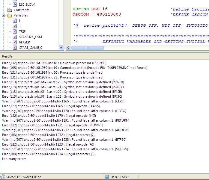 Now, in my other PC where I have PBP 2.60c and MPASM v8.15 I get a bunch of errors when compiling.