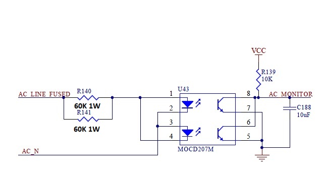 BTW - I'm using a PS205-1 AC input photocoupler. Works great with a 10k 1 watt resistor in the input.