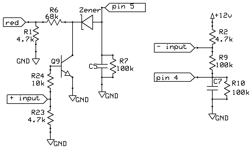 The circuit on the right is a negative trigger. Pin 4 sees 12 volts through the two resistors above. When ground is applied to the negative input, pin 4 is pulled low to trigger another routine on the pic.