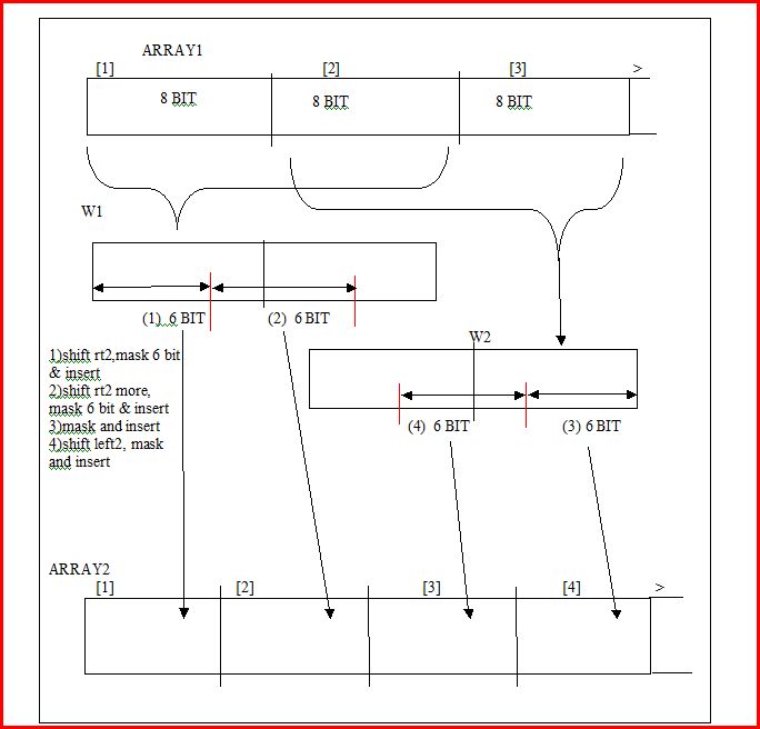 -The mid byte of the 24 bit Base64 is in W1 and W2 since it is used in destination byte 2 and 3