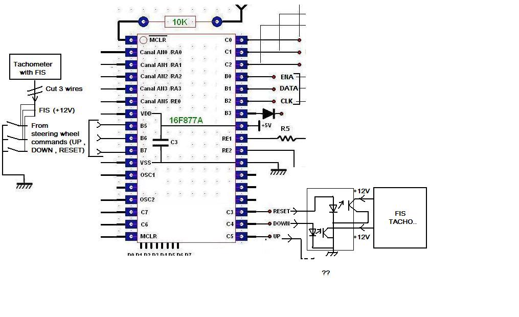 a detection for RBx cause a different display to FIS Tachometer and for input isolator (output RC5,6,7) cause a +5V and +12V on output isolator .