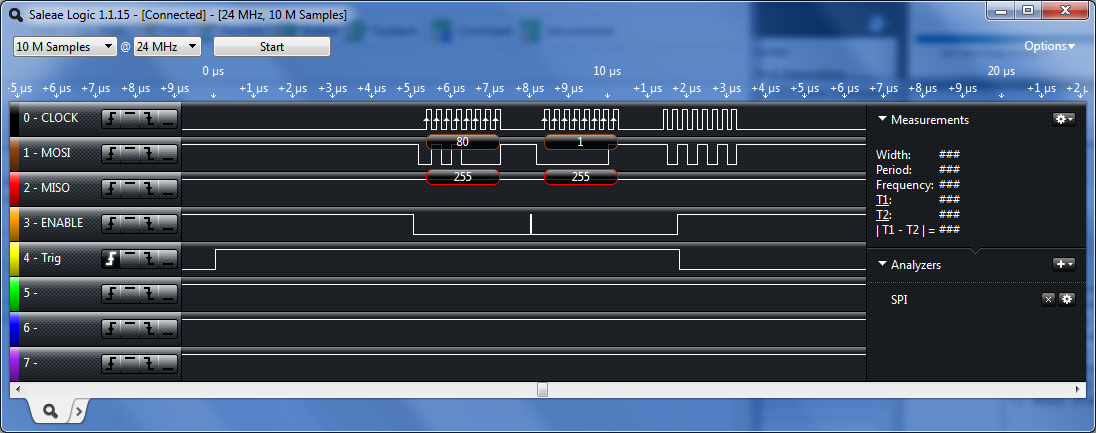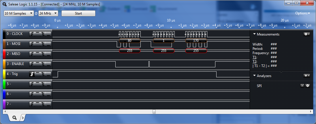As you can see here the ENABLE line is pulled low then the first command (80) in sent. Then there's a pulse on the ENABLE line after which a new command (1) and finally the data (170) is sent. When the last bit is out the ENABLE line goes high. This is all as expected and it works.