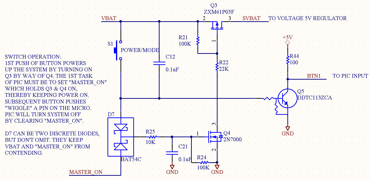 The "gist" of the way it works is the very first button push will switch power on. The PIC must quickly set the "Master_On" signal to keep power on. Subsequent button presses will simultaneously try to power the system up again, but since it is "already" powered up, it will simply toggle the "BTN1" signal.