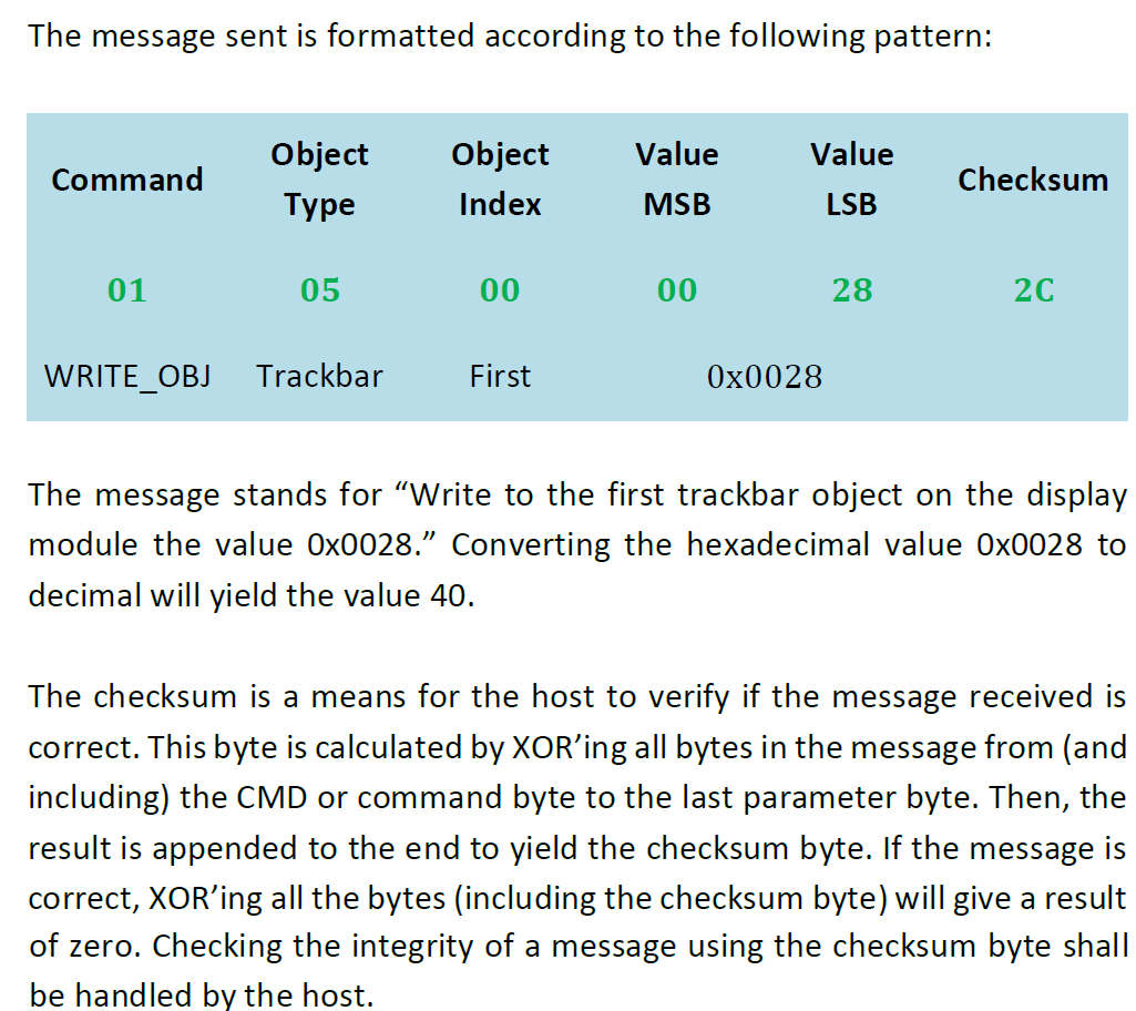 It is the first time i had to do a task with Checksum and found it interesting way by XORing all the bytes. In a very small code i tryied it worked, as i sent based on 4D Systems the command to change the constrast and it worked.