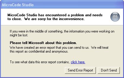 I have Microcode Studio MCSX that came with PBP 3.0. Right from the start there have been consistent problems with MCSX stopping, shutting down, and showing the error message below: