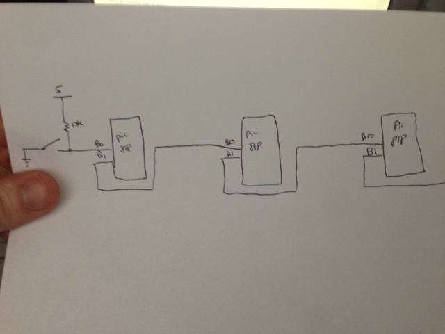 All processors Idle till they receive a 0 on ign. Once the first processor in line goes to zero. It goes to serin. if serin times out. This processor is then assumed to be the master. module is incremented by one to send ID to next processor. It then sends a ground signal out of "out" to advanced the next processor into serin. The master then serouts 5 times (even though I want it to be one). Then goes to a pulse counting state on "out". The second processor receives its module number from serin. stores to eeprom then, increments "module" sends a ground pulse to next processor to get it ready for serin in. After that each slave after that does the same. after it sends serout to next processor. It sends a ground pulse back to previous processor to count. Then it listens on "out" for ground pulse and everytime it gets a ground pulse it just sends the pulse out of "ign" back to the master which then counts how many slaves have been generated. Everything in program works flawlessly except for the serin and serout. as for some reason serin times out and then a slave thinks it is the master also. Just need to know why this is. It is either setup timing, noise (doubt it) or possibly when in serin state it looses its pull up resistor state on B.0 (which is enabled)