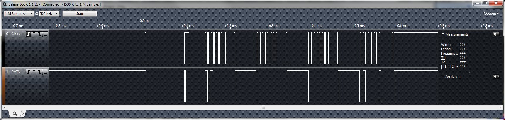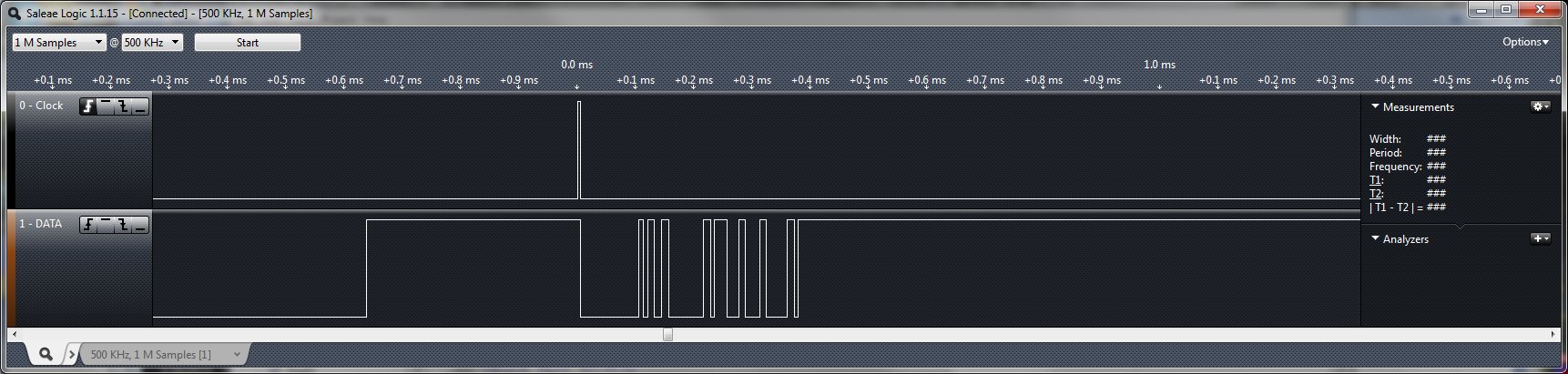 I am running the Internal OSC at 16MHz. I did try slowing the clock down and it still didn't work. I am not sure if the Clock is whacked or if my Logic Analyzer is just too slow to capture it (500kHz is as fast as it will run on my computer for some reason).