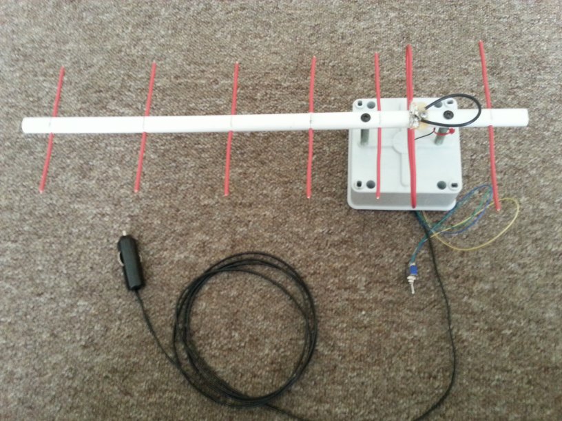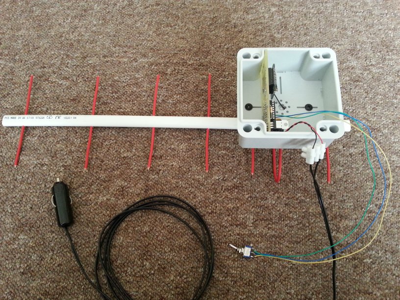 Pictures of the prototypes. The 9db gain yagi aerial is made from oval plastic electrical conduit using UK 2.5mm twin and earth wire for the elements.