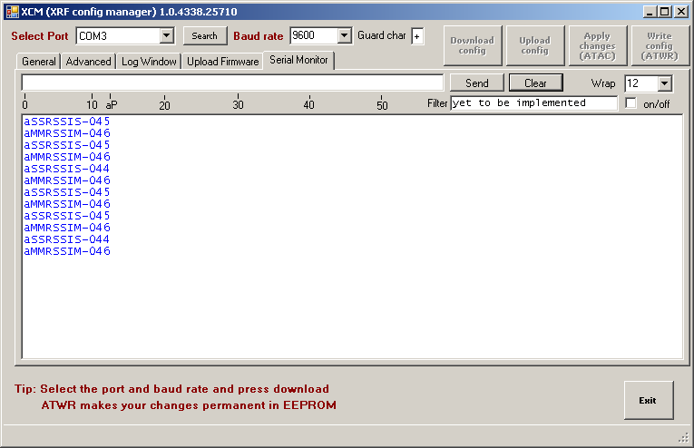 In order to test the range between two devices, it is possible to put two XRF's into a special mode via either the AT commands or the XCM. Once in the special mode it will send a packet once a second from an XRF connected to your PC (master) to another 'remote' (slave) XRF. The slave XRF will measure the incoming RSSI level and send the packet straight back. The master XRF then measures the RSSI of this and displays both packets serially.