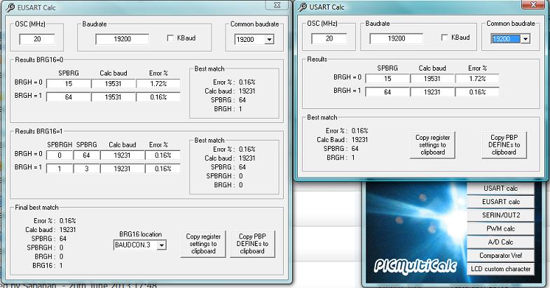 Hi Can someone list the settings here from PICMultiCalc for 20MHz Osc, 16F877A @ 8N1 + 19200 Baud rate please as the calculator is not working on my computer. Thanks