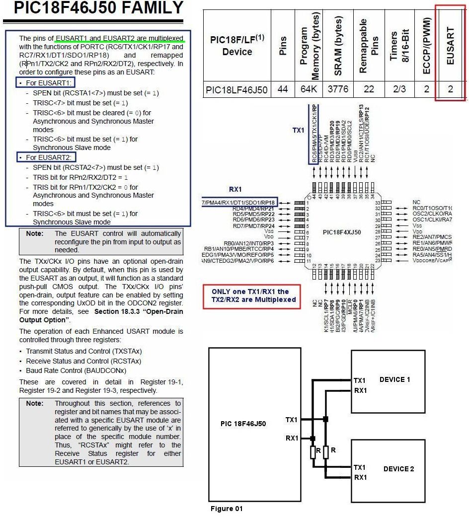 I like to know how they connect. If the two devices are connected to the same bus RX / TX. Summarizing How to connect two devices in the pic USART EUSART1 and EUSART2 that are multiplexed.