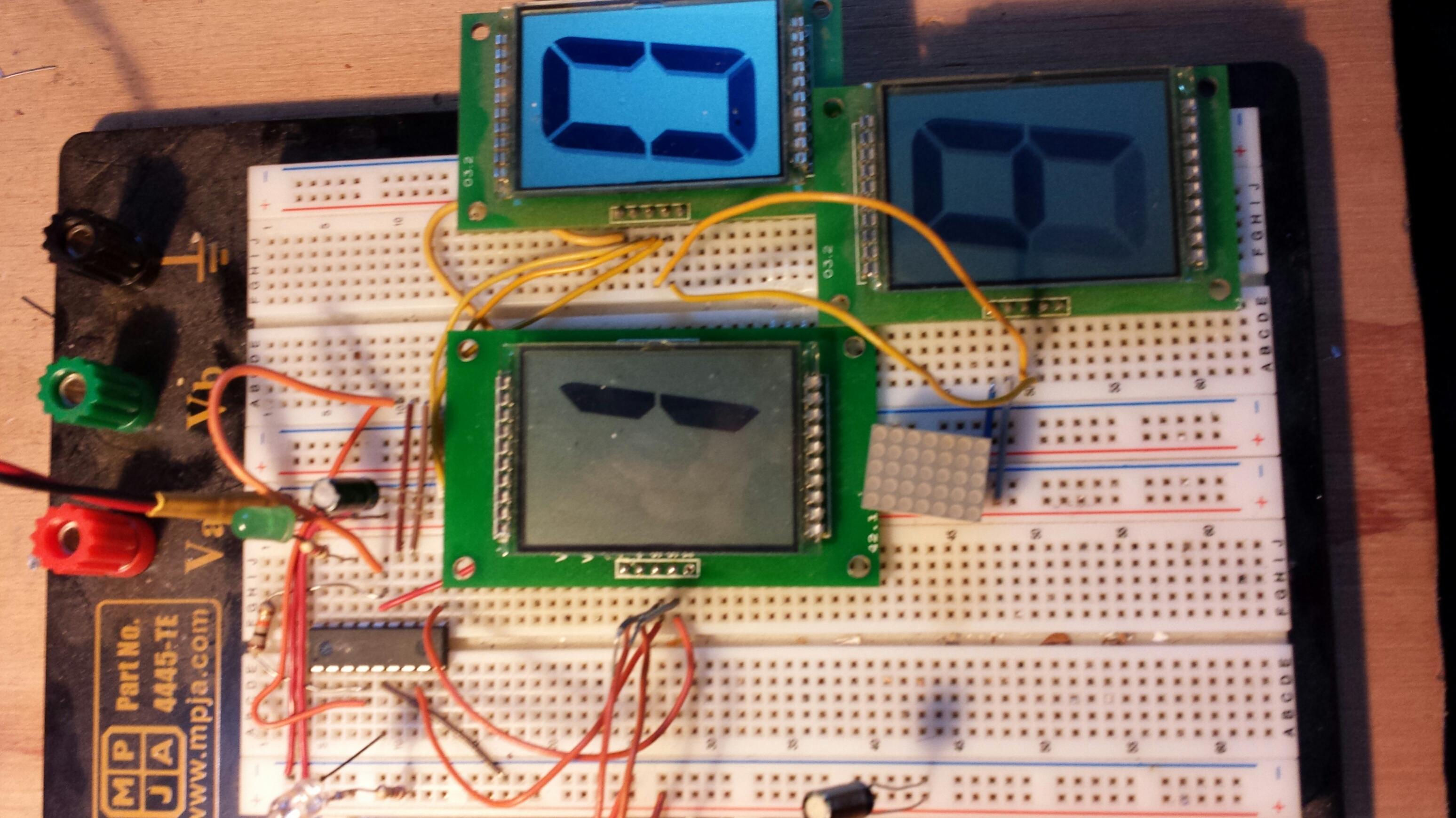 Some time ago I bought several big, beautiful, single character LCDs. These things are 1.5" tall and just scream, "Look at me I'm cool!" I ordered up some backer-boards, populated them with PCF8574 port expanders and my gorgeous new chips, bread boarded several and had this really nice display all working. Oh, it was a thing of beauty! Then, the economy took a turn, job... etcetera.