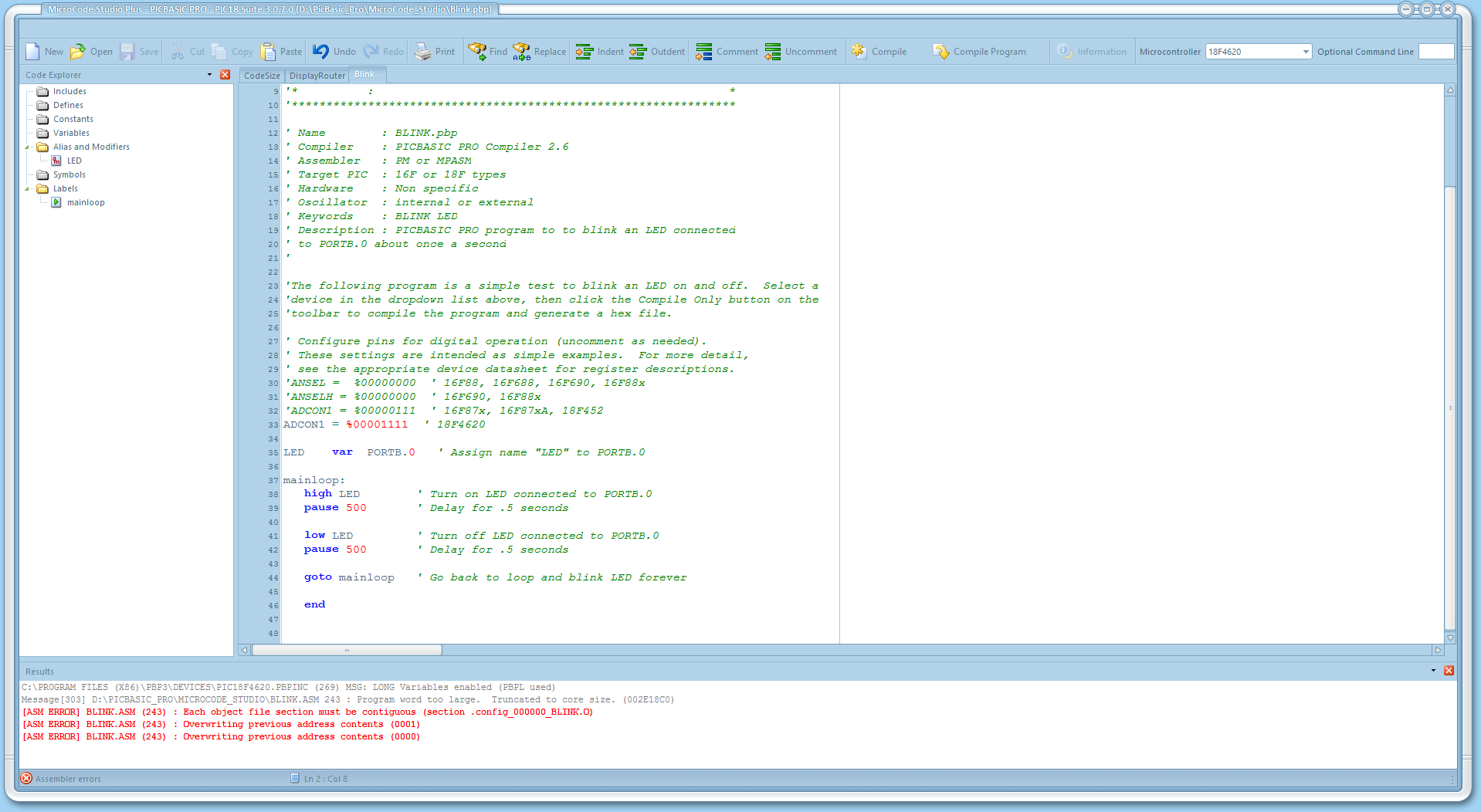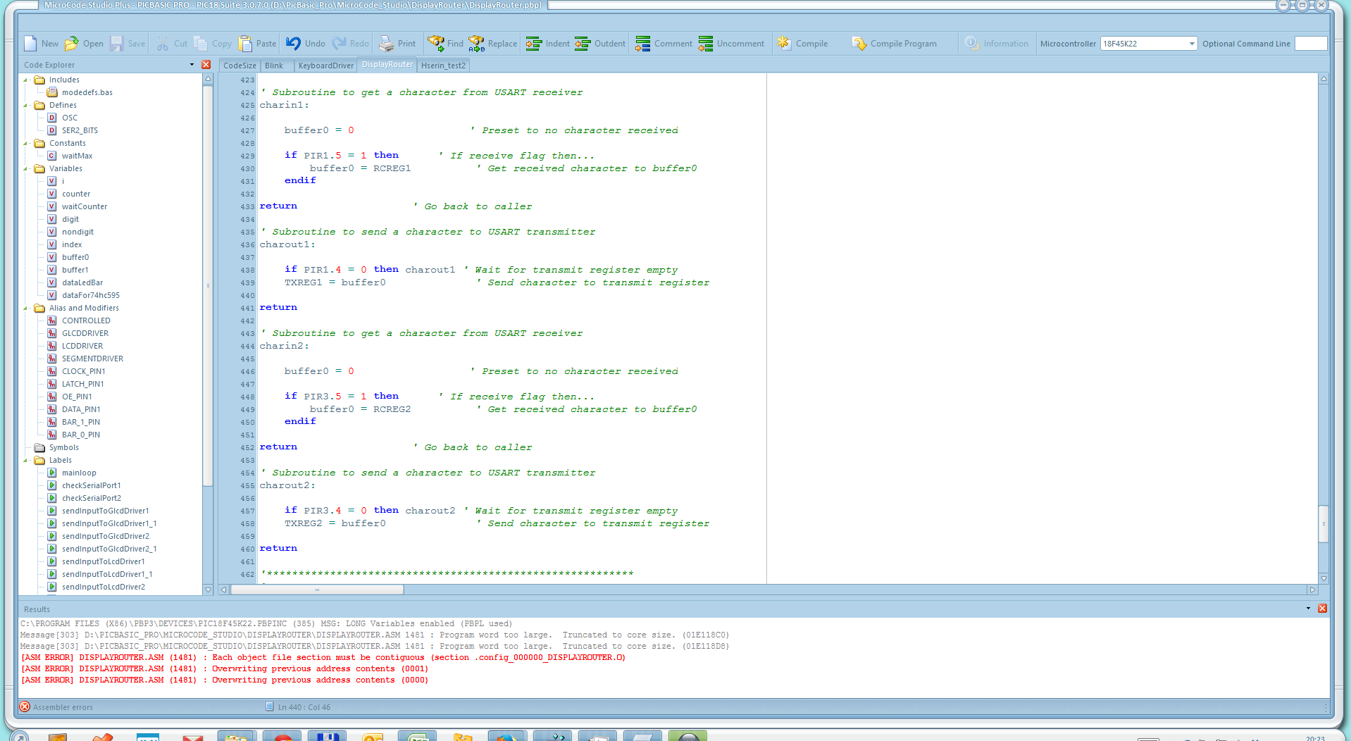 Okay, here's a longer program (DisplayRouter.pbp) I have written that I Regularly inspect uploaded to my PIC18F45K22. It has now run for several months. Now it will not compile anymore ...