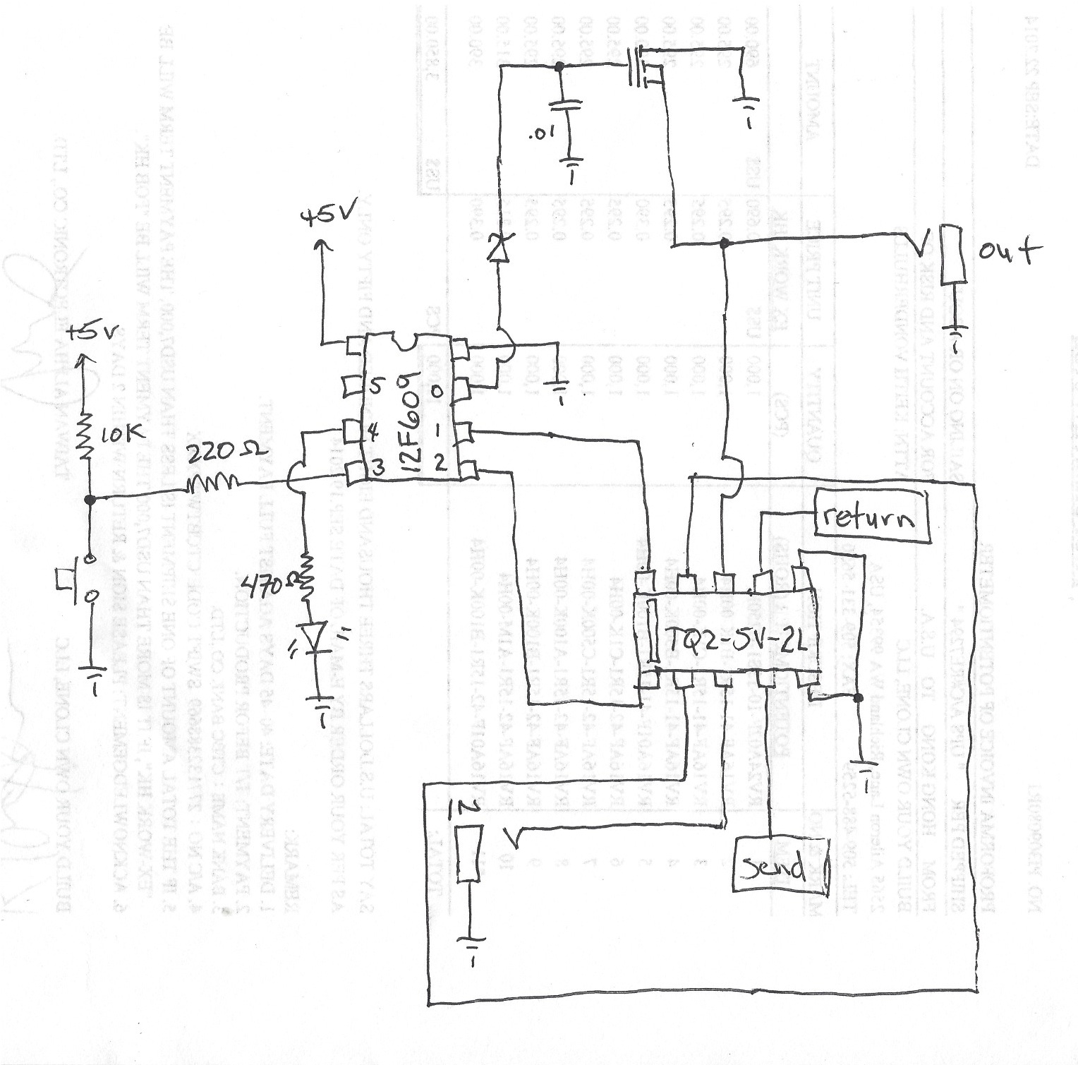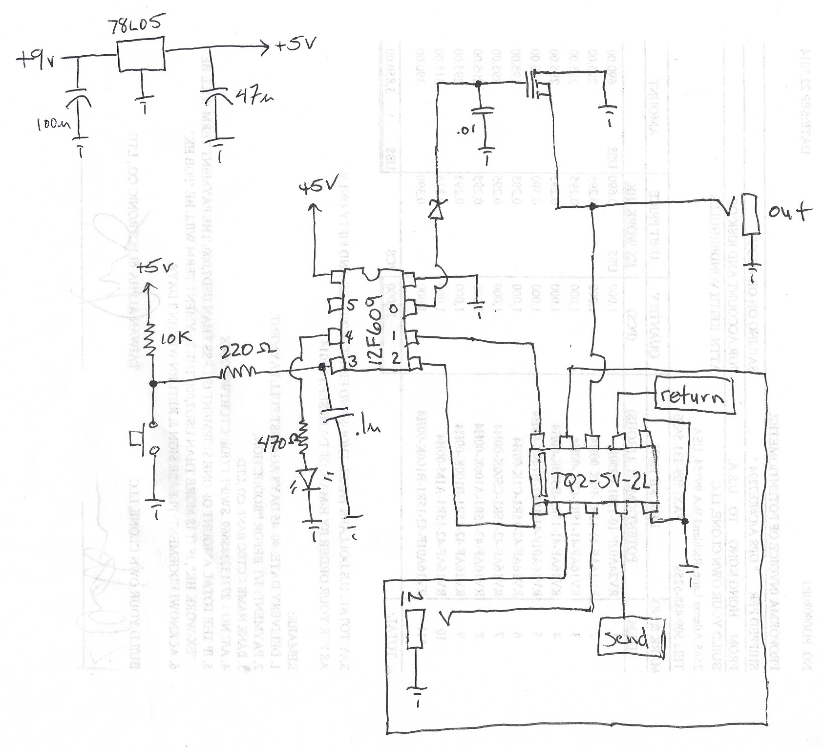 Here's an updated schematic. It shows the power supply. I also forgot to include a 0.1uF cap off of GPIO.3 to help with debounce.