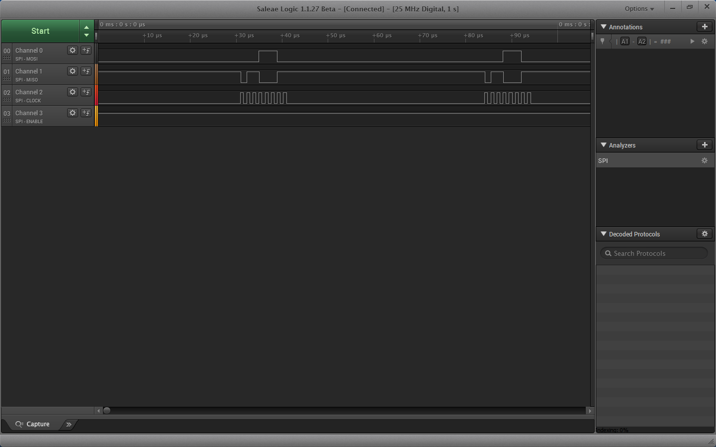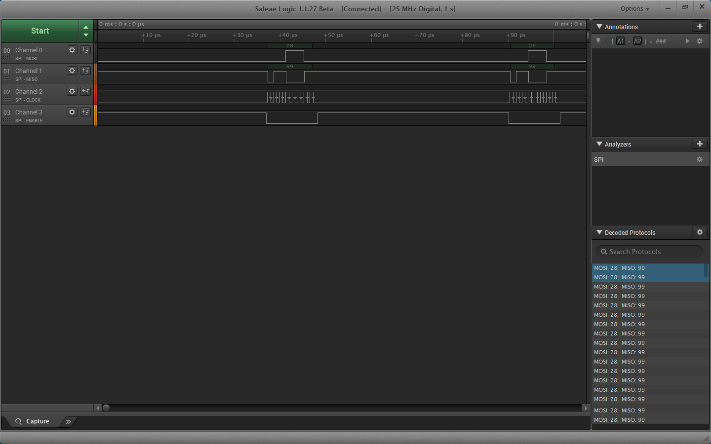 The problem is that when I test this without dropping the SS line low to enable I still see the MISO transmission from my slave. I thought that if SS does not go low then the slave chip would not be enabled? Why would the slave respond even when its SS pin is high as seen in the screenshot below from my analyzer?