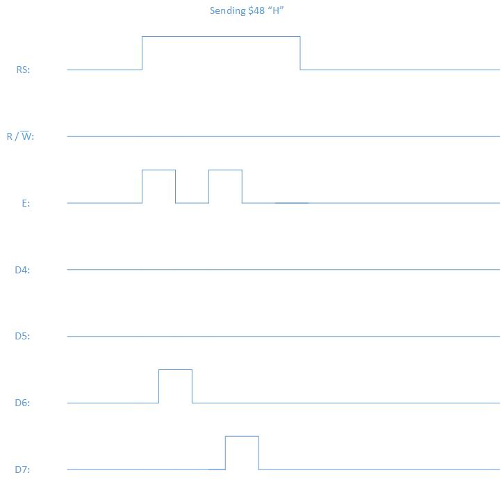If you were to send an "H" $48 to an LCD with a 4bit interface, you should see something like this.