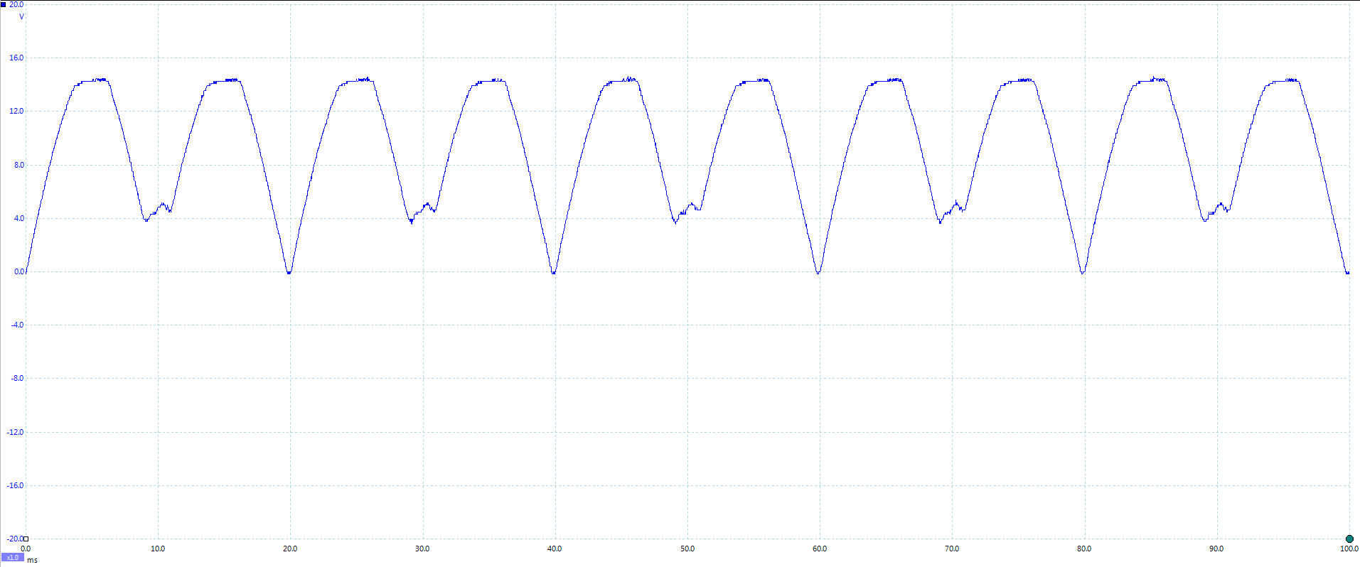 When I measure the raw AC out of the transformer with a scope I see a nice sine wave as expected. When I measure after the rectifier I see what almost looks like DC ripple but with every 2nd trough cut off. (screenshot attached)