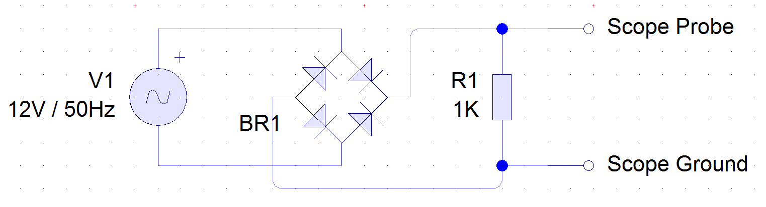 I've actually got 2 circuits. The one described in the initial post is a test circuit to try to isolate a problem I was seeing in the full circuit. The scope ground is connected to the negative side of the rectifier output in both circuits.