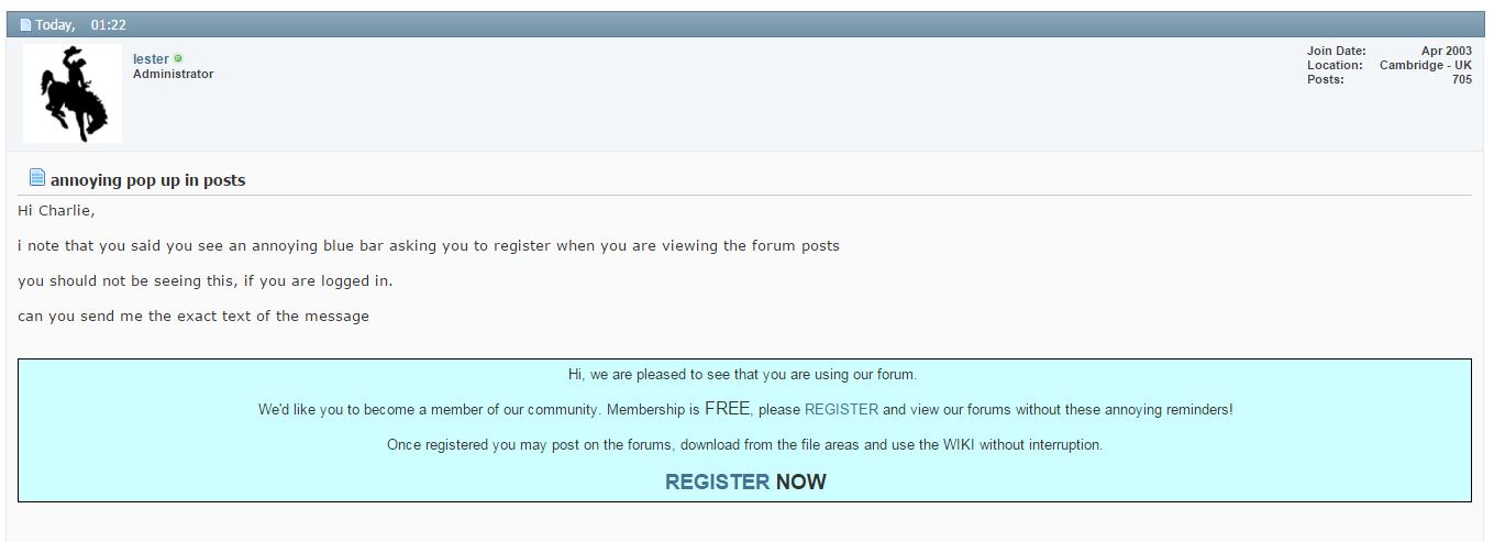 Once registered you may post on the forums, download from the file areas and use the WIKI without interruption.
