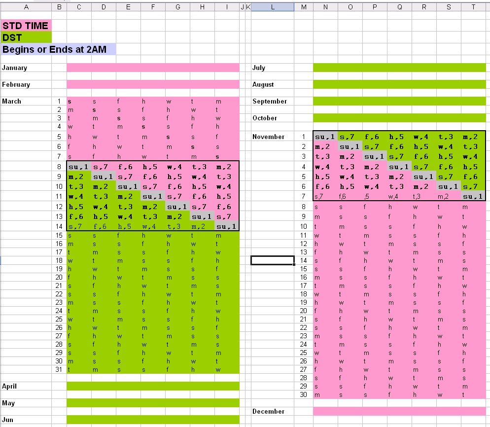 below is a shot of a spread sheet that I made to try and account for all possibilities for when a given month (March and November) might begin.
