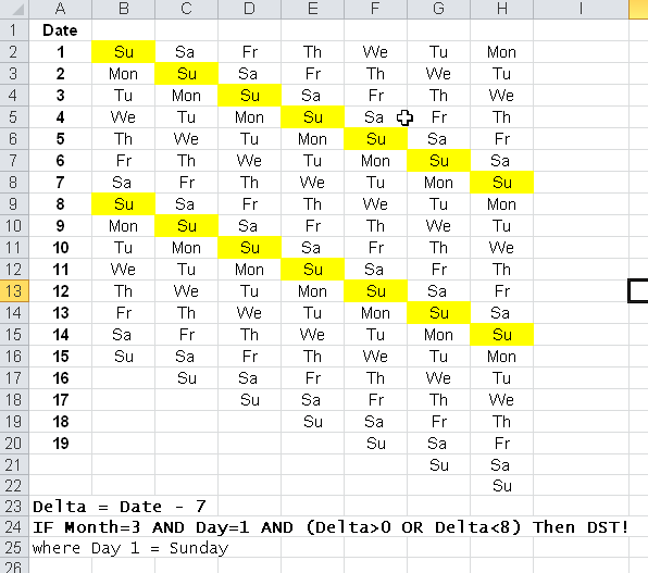 IF Month=3 AND Day=Sunday AND (Delta>0 OR Delta<8) Then DST!