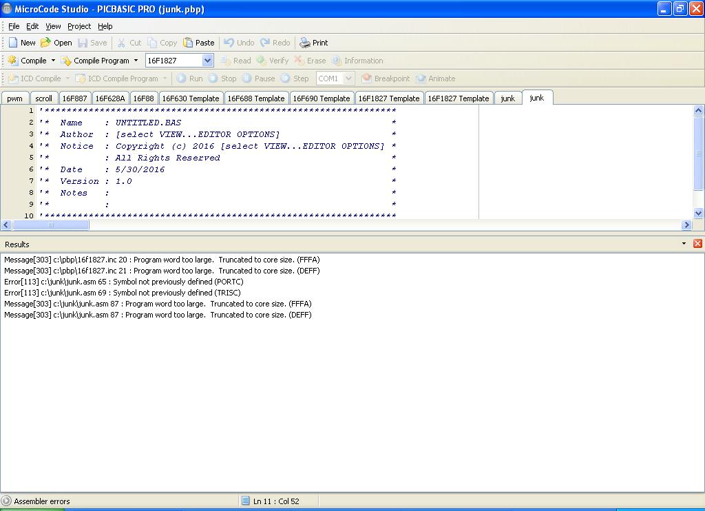 That's the point. I have done these templates for about 6 or so PICs without any problems. They are only to set the config bits. Yet for the '1827 they think that I am referring to ports and tris registers. All I'm referring to are config bits.