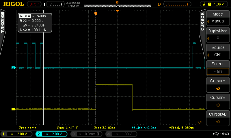 The top (blue) trace shows the output normally toggling at a fast rate. The bottom (yellow) trace shows the pulse generated by the code in the interrupt service routine. If we zoom in a little bit we can put some cursors on the screen and measure the latency: