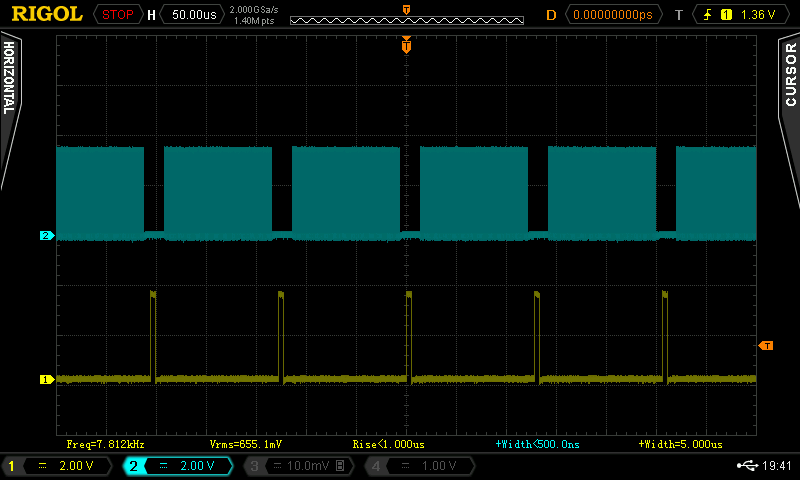 To measure this I wrote a very simple piece of code, all it does is toggle an output as fast as it can. Then a periodic timer interrupt was introduced and in the actual interrupt service routine a short pulse on another output was created. Here's what that looks like on a scope: